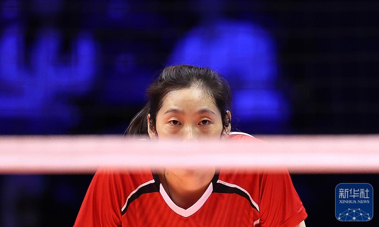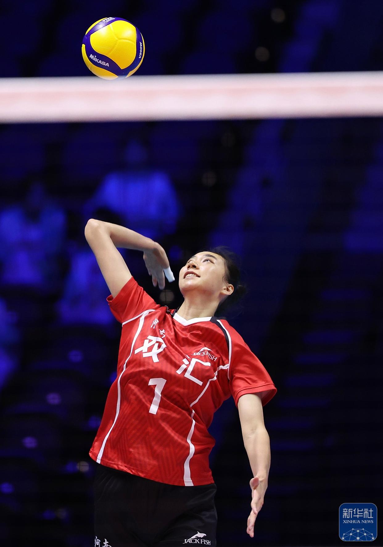 ↑ 河南队球员段梦可(中)在比赛中发球。