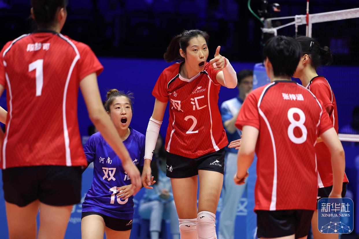 ↑ 河南队球员朱婷(中)在球队得分后向队友竖起大拇指庆祝。