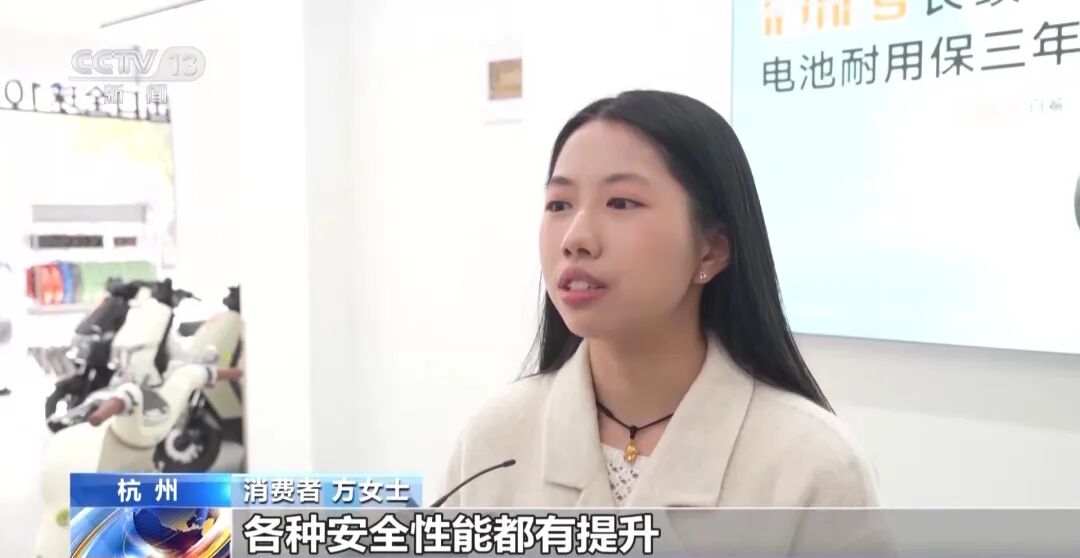 消费者方女士说:新国标相对于旧国标,各种安全性能都有提升,上路也会相对更加安全,我也会更加放心。