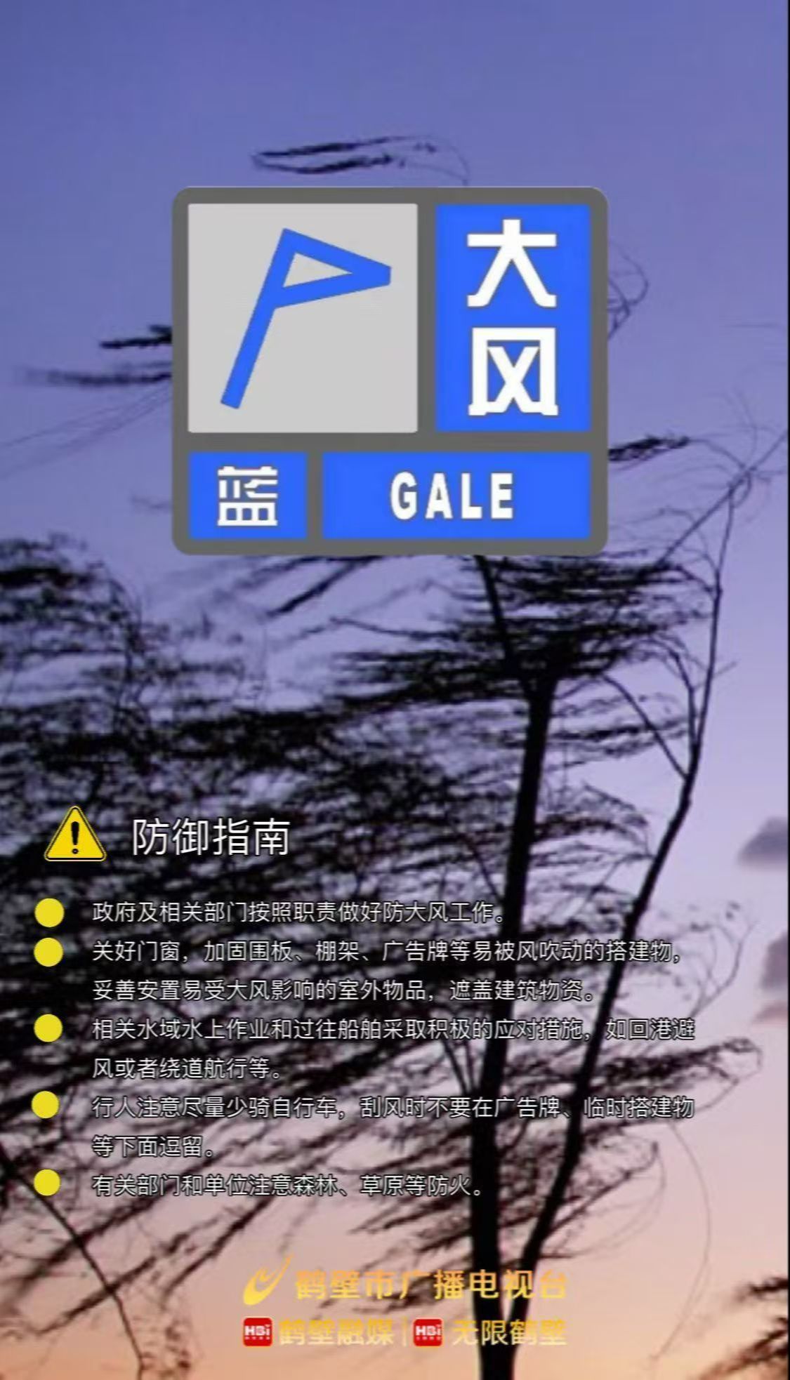 鹤壁市气象台2025年12月10日22时50分发布大风蓝色预警信号:预计未来24小时,鹤山区、山城区、淇滨区所辖乡镇和街道将有4到5级偏北风,阵风7级以上,请注意防范大风造成的不利影响。