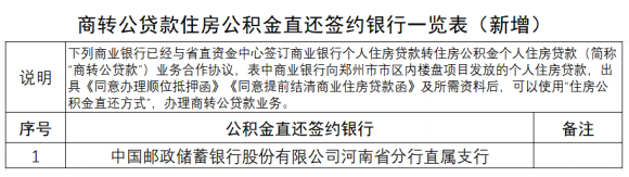 近日,河南省省直机关住房资金管理中心发布通知,新增商转公“住房公积金直还”合作签约银行——中国邮政储蓄银行股份有限公司河南省分行直属支行。