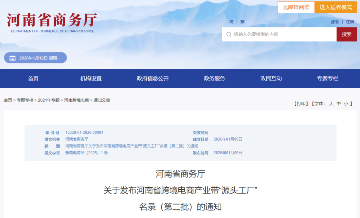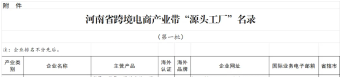 2025年5月26日,河南省商务厅发布跨境电商产业带“源头工厂”名录(第一批)。名录包括家具家居、机械制造、工程建材、电子信息、新材料等17个种类,其中涉及鹤壁8家(河南省朗萃科技有限公司、河南省贝迪塑业有限公司、鹤壁海昌智能科技股份有限公司、鹤壁市诺信电子有限公司、河南特创生物科技有限公司、河南新亚服装有限公司、鹤壁飞鹤股份有限公司、河南给力体育用品有限公司)。