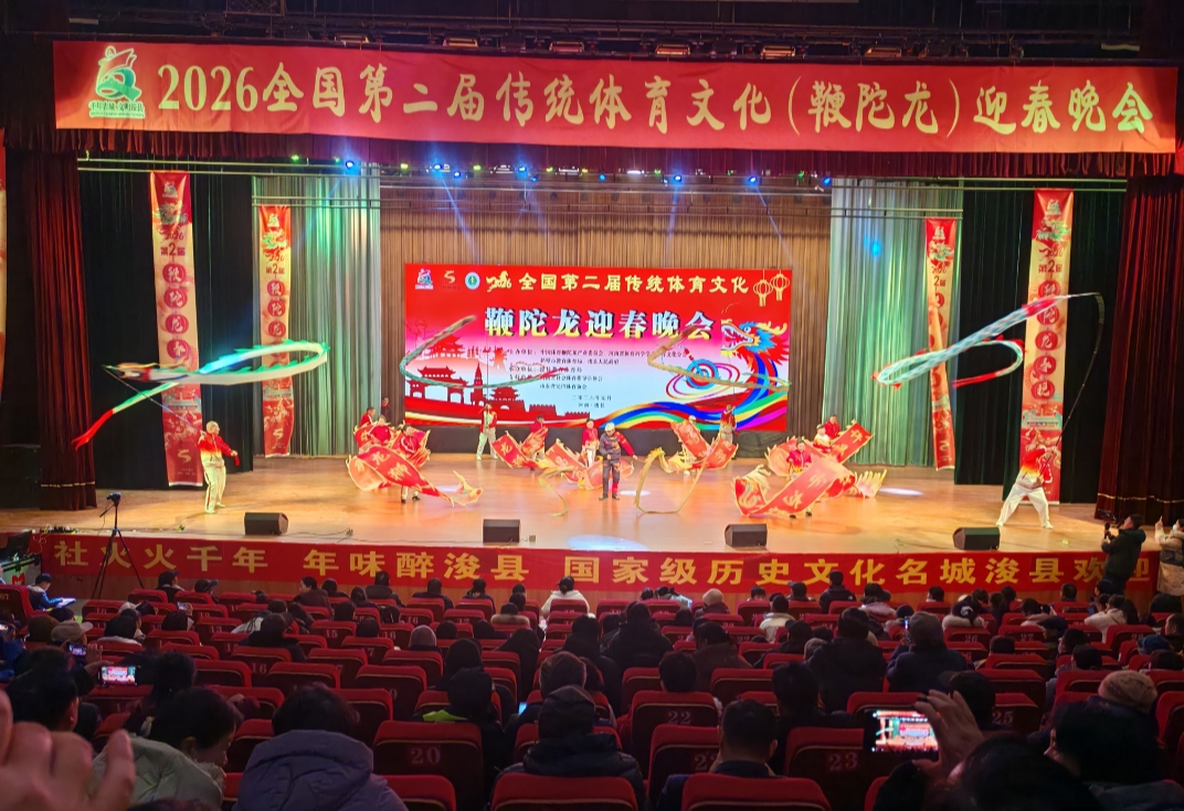 1月17日下午,2026第二届传统体育文化(鞭陀龙)迎春晚会在浚县文化中心举行。鞭陀龙迎春晚会是以鞭、陀螺、舞龙为核心表演的民俗体育新春活动,融合传统鞭术、陀螺技巧与舞龙表演的新春晚会,是民俗与健身结合的文化活动,兼具观赏性与互动性。