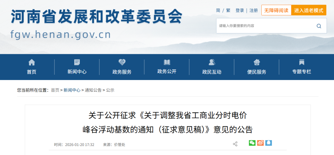 1月20日,河南省发展改革委发布《关于调整我省工商业分时电价峰谷浮动基数的通知(征求意见稿)》( 以下简称《意见稿》)。