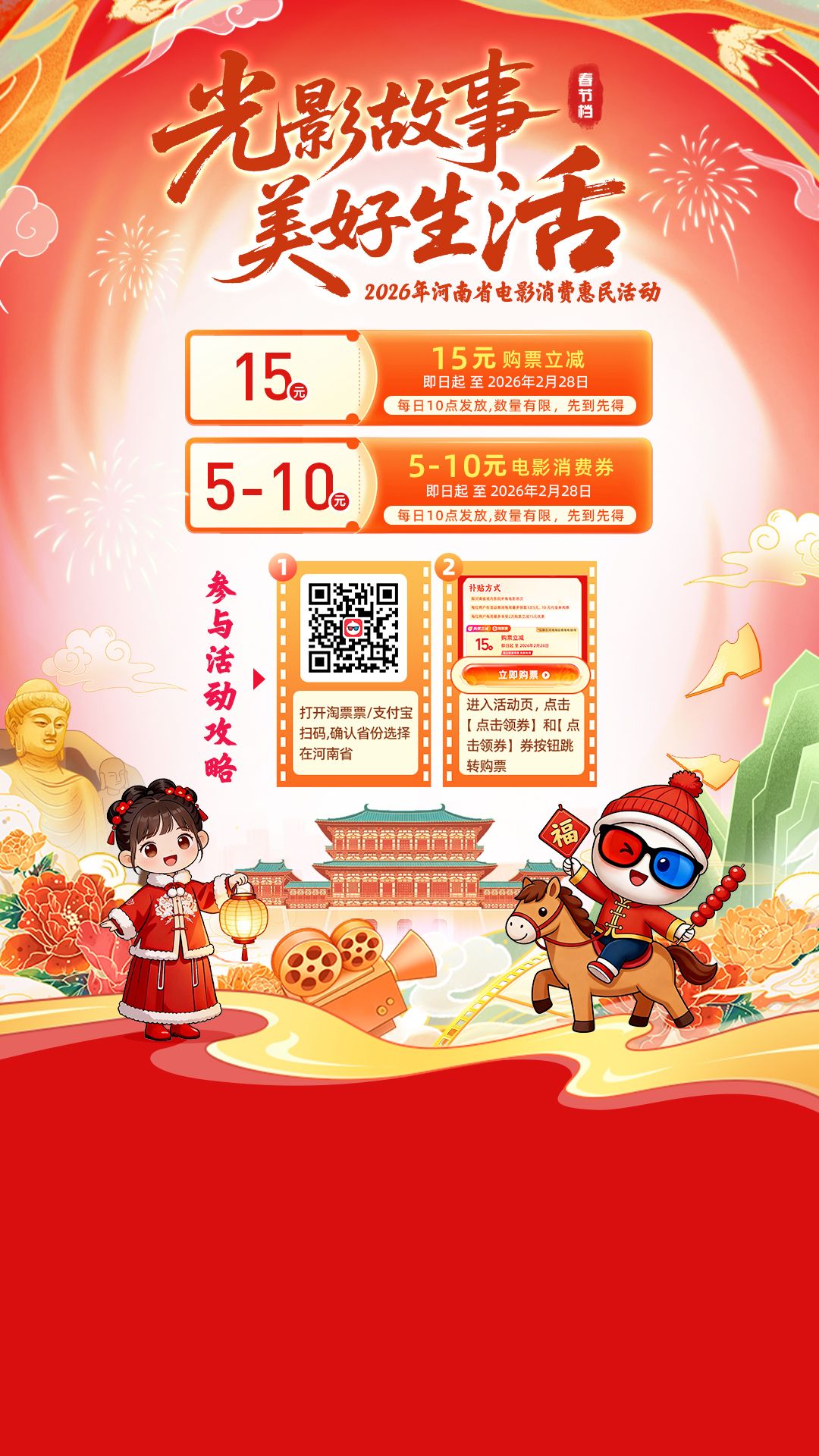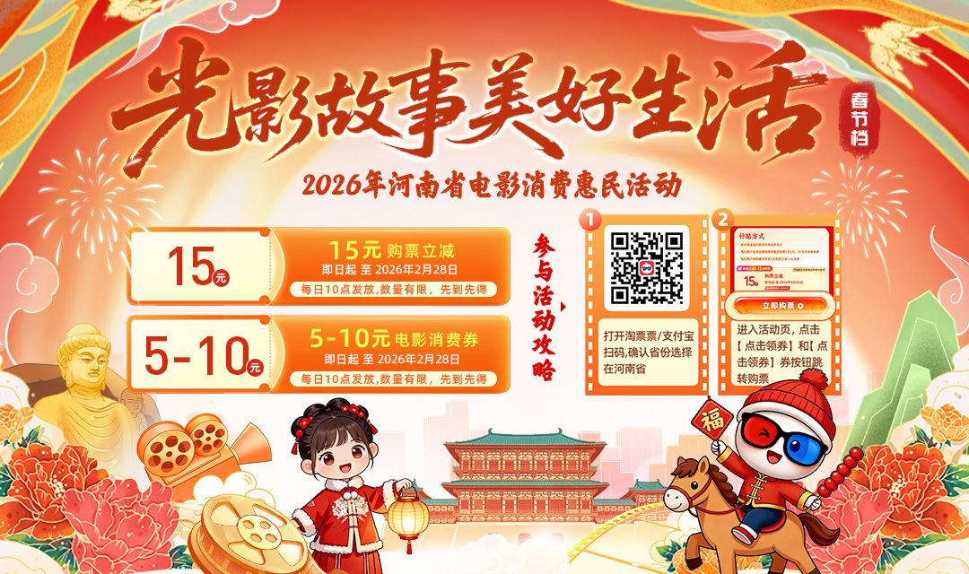 2026年春节即将来临,为丰富节日期间群众文化生活,促进电影市场消费,河南省委宣传部联合淘票票平台继续开展“光影故事 美好生活”观影消费补贴惠民活动,活动覆盖省内所有影院、所有春节档期影片。通过每日发放优惠券、购票立减等方式,鼓励电影市场消费。