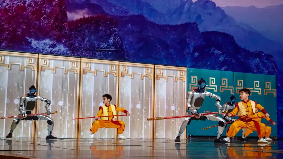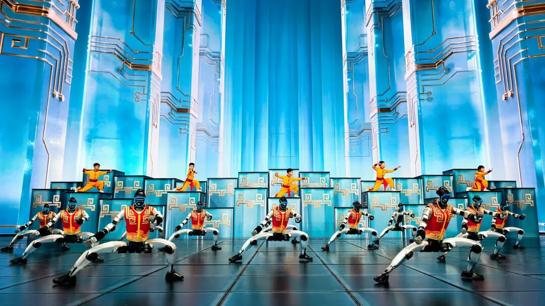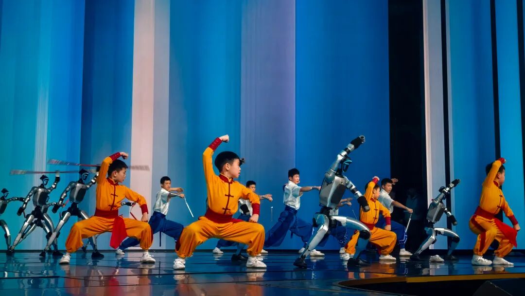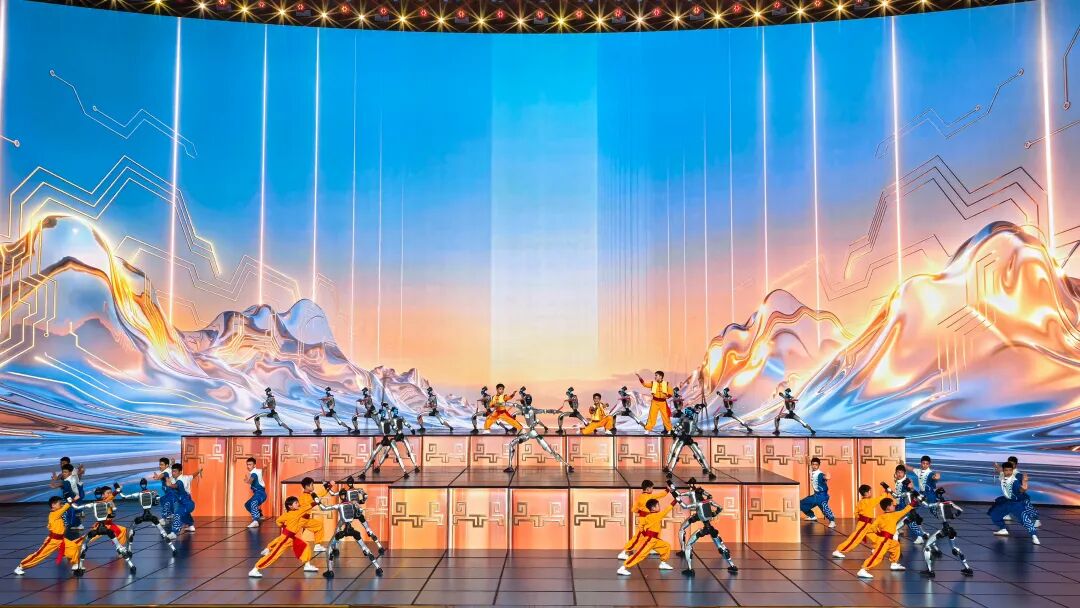 欢快的旋律中,3名功夫少年自观众席跃出,一招一式利落刚劲。大幕徐升,身披科技感的机器人整齐列阵,与少年们同步起势,人机合一的武术操练动作划一、气势如虹,瞬间点燃全场,尽显传统武魂与现代科技的初次碰撞。