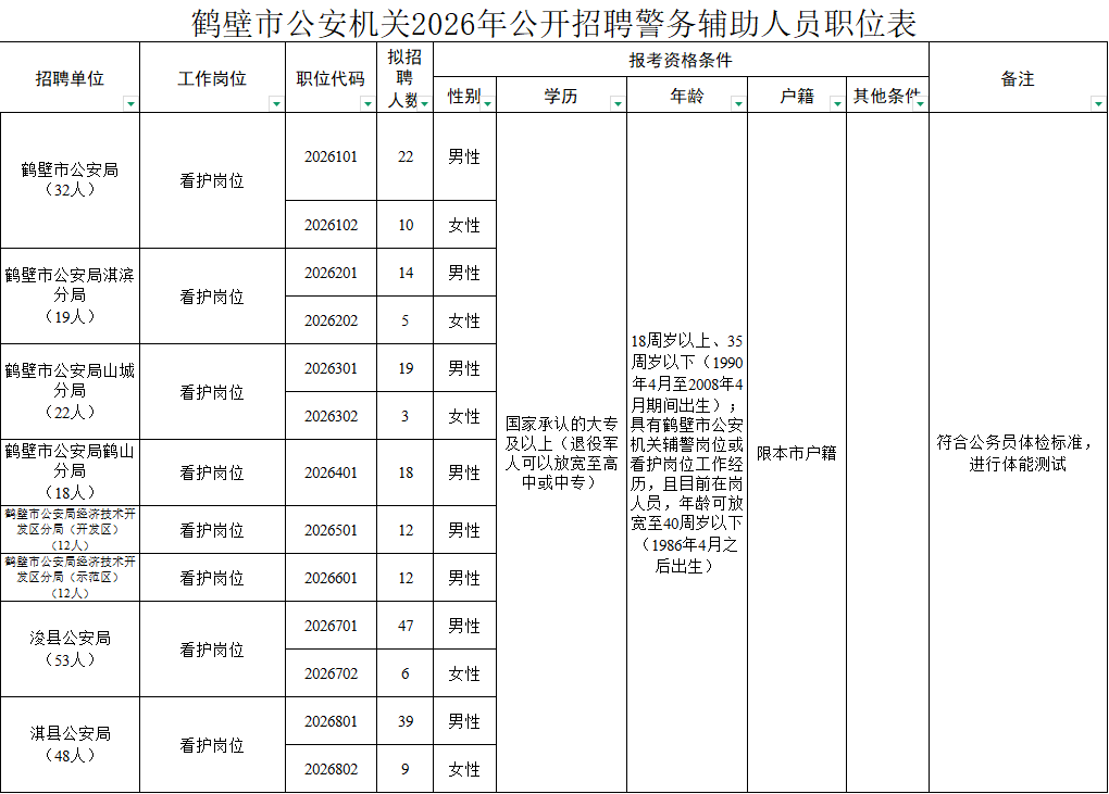 鹤壁市公安机关计划招聘辅警216名。具体招聘职位及有关要求详见附件。