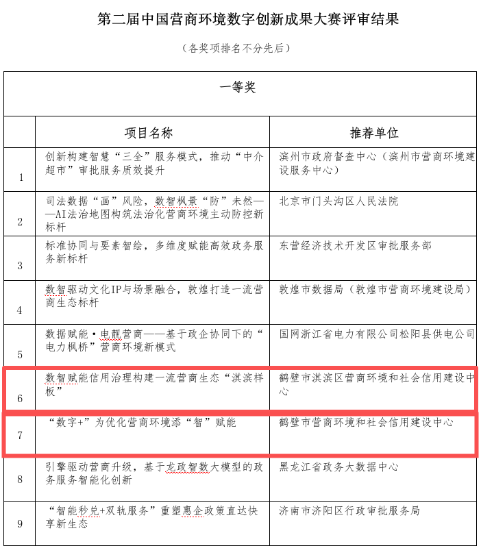 近日,第二届中国营商环境数字创新成果大赛评审结果揭晓,鹤壁市报送的《“数字+”为优化营商环境添“智”赋能》案例和淇滨区报送的《数智赋能信用治理 构建一流营商生态“淇滨样板”》案例,双双荣获一等奖!