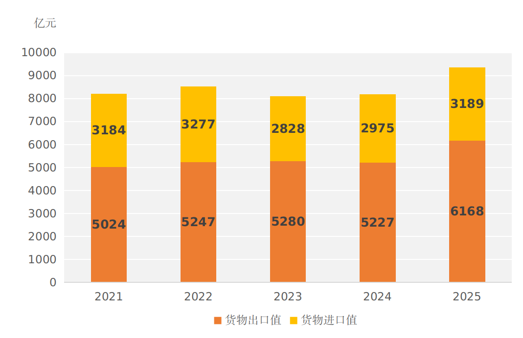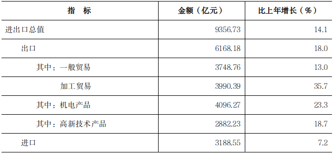 全年全省货物进出口总值9356.73亿元,比上年增长14.1%。其中,出口6168.18亿元,增长18.0%;进口3188.55亿元,增长7.2%。