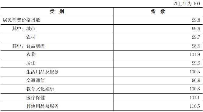 全年全省居民消费价格比上年下降0.2%。工业生产者出厂价格下降2.8%。工业生产者购进价格下降2.1%。农产品生产者价格下降5.7%。