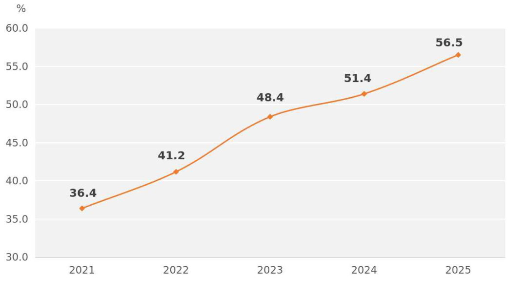 图5 2021-2025年河南省可再生能源装机容量占发电装机容量(不含储能)比重