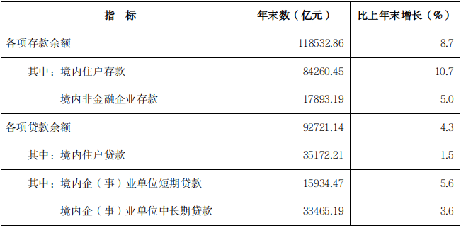 年末全省金融机构本外币各项存款余额119037.12亿元,比年初增加9590.19亿元,其中人民币各项存款余额118532.86亿元,增加9468.82亿元。金融机构本外币各项贷款余额92947.89亿元,增加3690.63亿元,其中人民币各项贷款余额92721.14亿元,增加3810.91亿元。