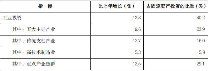 全年全省固定资产投资比上年增长4.0%。其中,第一产业投资下降2.6%,第二产业投资增长13.3%,第三产业投资下降1.4%。基础设施投资下降5.4%,民间投资增长5.9%,工业投资增长13.3%,重点产业链群投资增长12.5%。