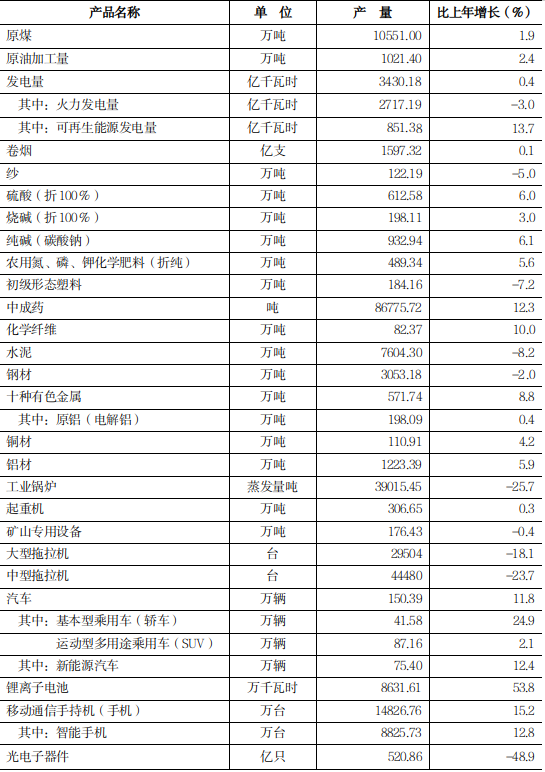 全年全省规模以上工业增加值增长8.4%。分经济类型看,国有控股企业增加值增长5.8%;股份制企业增长7.9%,外商及港澳台商投资企业增长14.4%;私营企业增长9.2%。分门类看,采矿业增加值增长4.8%,制造业增长9.9%,电力、热力、燃气及水生产和供应业增长0.5%。分行业看,煤炭开采和洗选业增加值增长8.9%,农副食品加工业增长12.7%,食品制造业增长15.1%,化学原料和化学制品制造业增长9.7%,非金属矿物制品业增长3.5%,黑色金属冶炼和压延加工业增长2.5%,有色金属冶炼和压延加工业增长8.2%,金属制品业增长15.5%,汽车制造业增长14.7%,电气机械和器材制造业增长20.8%,计算机、通信和其他电子设备制造业增长14.1%。重点产业链群增加值增长9.5%,占规模以上工业的63.9%。